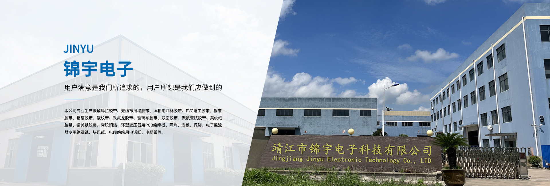 靖江市錦宇電子科技有限公司地處—靖江市。與上海、南京隔江相望,滬寧高速和京滬高速將蘇錫常及京廣連為一體,東依開放港口城市南通,西連新長鐵路,南臨長江萬噸船用碼頭,北接寧通一級高速公路,水陸交通便捷,經營環境優良。    本公司專業生產聚酯瑪拉膠帶、無紡布擋墻膠帶、照相用菲林膠帶、PVC電工膠帶、銅箔膠帶、鋁箔膠帶、皺紋帶、鐵氟龍膠帶、玻璃布膠帶、雙面膠帶、聚酰亞胺膠帶、美紋紙膠帶、諾美紙膠帶、背膠銅箔、環型變壓器用PCB絕緣板、隔片、底板、假腳、電子整流器專用絕緣紙、塊巴紙、電纜絕緣用電話紙、電纜紙等。    公司依靠先進的科學管理,精良的生產裝備,合理的工藝設計,完善的檢測設備,以著“科技創新、質量為本、誠信服務”的信念。并嚴格貫徹ISO9001國際質量體系的程序和規格,為廣大用戶提供優質的產品與滿意的服務。    多年來,公司本著“用戶滿意是我們所追求的,用戶所想是我們應做到的”的經營理念;“質量保障,價格合理,服務誠信”的企業宗旨。熱忱歡迎海內外各界人士、朋友前來洽談、合作,攜手共創輝煌的明天。